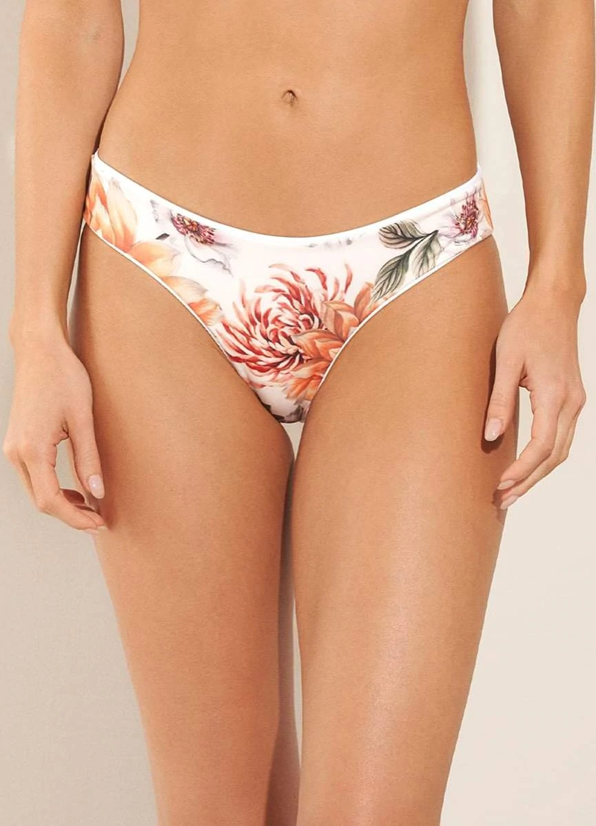 Figi kąpielowe marki Maaji o klasycznym kroju. Model posiada dwustronny wzór dzięki temu możesz je ubrać na dwa sposoby. Podstawą jest biały kolor na prążkowanym materiale. Drugi wzór to kwiatowy print na gładkiej, beżowej bazie. Wysoka jakość materiału.