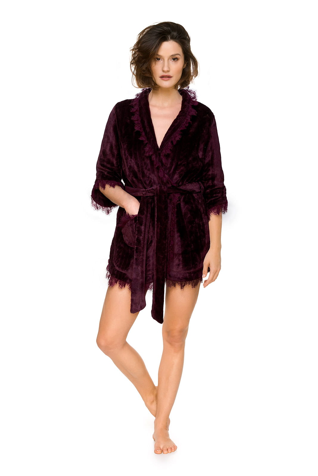 Szlafrok uszyty z ciepłego i otulającego materiału w kolorze śliwki, wykończony koronkową lamówką w tym samym kolorze. Szlafrok jest krótki i ma rękawy długości 3/4. Szlafrok w stylu podomki świetnie odzwierciedla założenia marki COEMI w tworzeniu bielizny nocnej funkcjonalnej a zarazem eleganckiej o ciekawym kroju i finezyjnych dodatkach.
