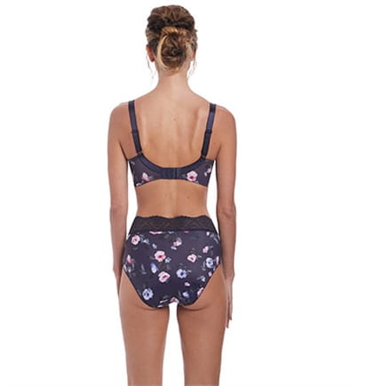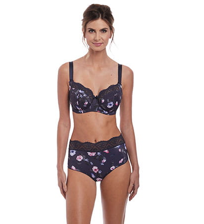 Katie to typowa balkonetka, która ładnie unosi i podtrzymuje biust. Stanik ma pełne miseczki, które posiadają wbudowany panel boczny tzw. side support zbierający piersi do środka. Miseczki biustonosza wykonane są granatowej tkaniny w kolorowy, kwiatowy wzór. Ramiączka biustonosza są szersze i w pełni regulowane.