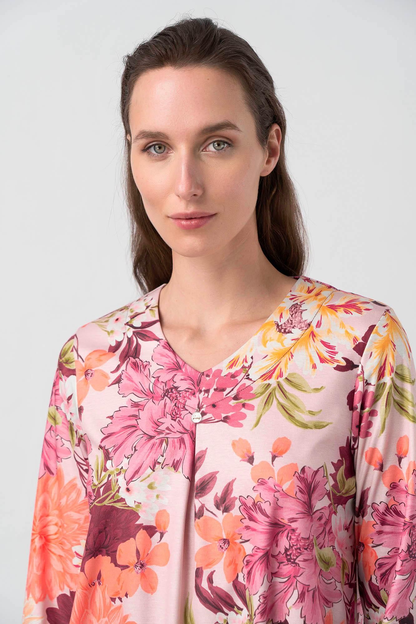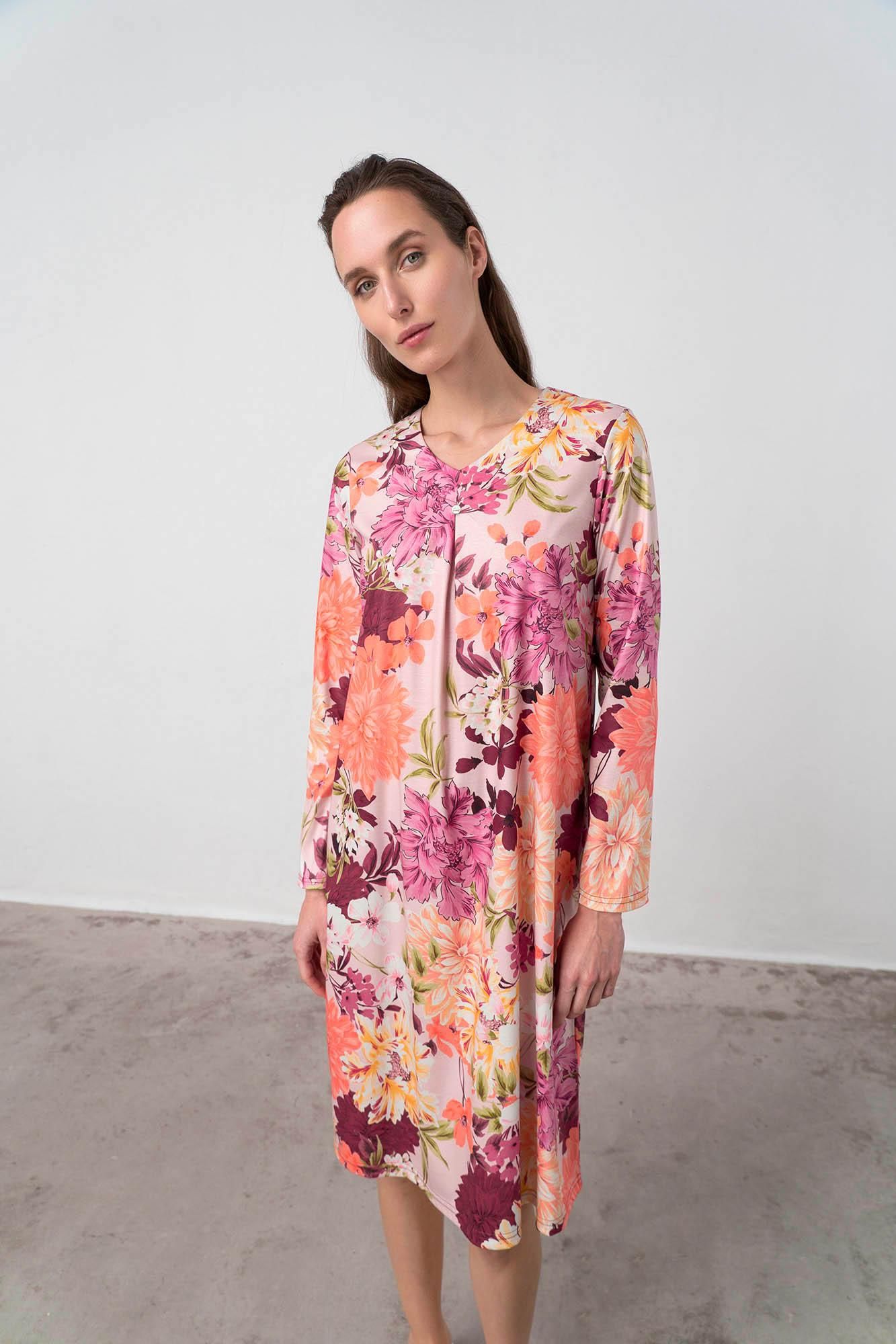 Koszula nocna wykonana w wysokogatunkowej bawełny. Prosta, niekrępująca ruchów forma. Okrągły dekolt z ozdobną zakładką. Długość za kolano. Piękny, kwiatowy nadruk.
