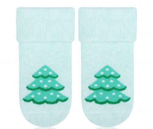 Wywijane bawełniane skarpetki dziecięce w kolorze miętowym z motywem choinki. Skarpetki są kolorystycznie uniwersalne zarówno dla dziewczynki jak i chłopca. Ciepłe - przyjemnie otulające malutkie stópki.
