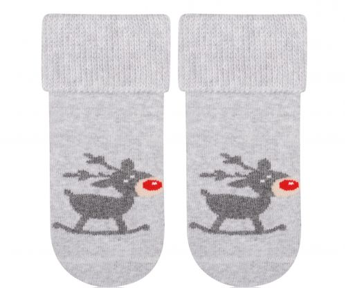 Wywijane bawełniane skarpetki dziecięce w kolorze szarym z postacią Renifera. Skarpetki są kolorystycznie uniwersalne zarówno dla dziewczynki jak i chłopca. Ciepłe - przyjemnie otulające malutkie stópki.